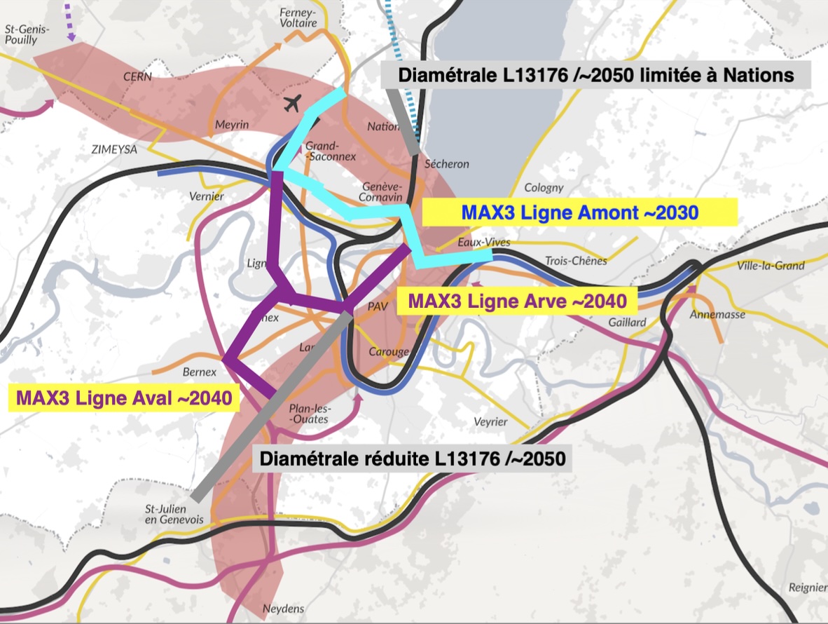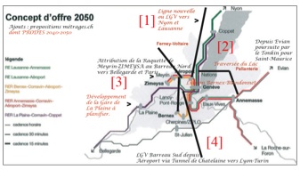 Source de l'illustration ci-contre : Courrier du Conseil d’Etat du canton de Genève au Département fédéral de l’environnement, des transports et des communications DETEC en date du 20 décembre 2017, annexe « Concept d’offre 2050 ». Par rapport à l'image d'origine, nous avons opéré l'ajout ultérieur de nos 4 axes.